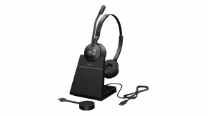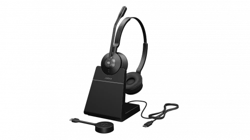 Jabra Engage 55 Stereo to słuchawki Nauszne. Bezprzewodowa łączność jest główną metodą ich komunikacji z źródłem emitowanego dźwięku. Wśród zaimplementowanych w nie technologii i funkcji znaleźć można: Jabra SafeTone - Ochrona słuchu przed skokami głośności oraz zmęczeniem, PeakStop - Eliminacja nagłych skoków głośności rozmów, IntelliTone - Automatyczne dostosowanie głośności, Wskaźnik zajętości. Czarny jest kolorem dominującym tego produktu.